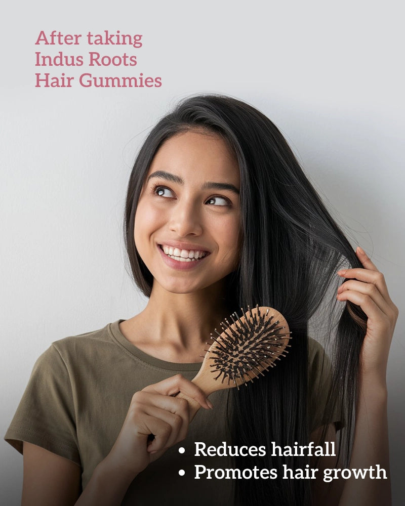 Crafted specifically for Indian hair, Indus Roots Hair vitamin gummies for Hair Growth and thickness have all essential nutrients (Biotin, Zinc, folic acid, Vitamin A, Vitamin C, and Vitamin E, you name it!). These gummy hair vitamins help you in reducing hair fall, premature greying, hair breakage and thinning, and give you the strong and beautiful hair that you deserve.